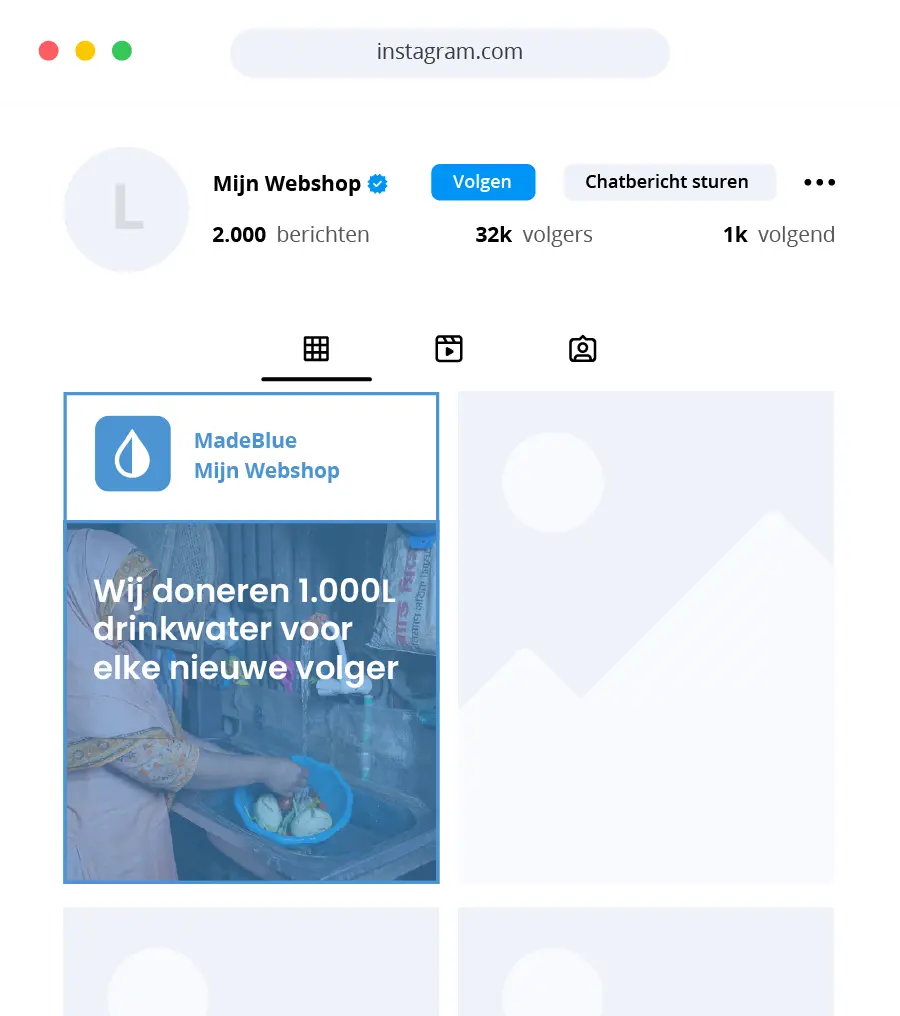 Steun als waterflessen webshop bijvoorbeeld MadeBlue en doneer voor elke social media-volger schoon drinkwater. Elke nieuwe volger = 1000 liter drinkwater.